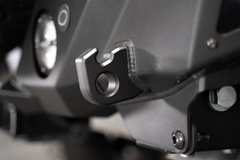 The Krawler Rear Bumper was designed for heavy trail use and features high clearance angles. Its low profile fitment and modern plate steel construction is well suited for rock crawling. Two 3-4-inch round light mounts provide options for supplemental rear lighting. The Krawler accommodates the OEM Tire Mount & back-up camera, as well as the factory hitch and trailer harness. Included with the bumper is a 3rd brake light extension bracket compatible with up to a 37-inch spare tire, and a license plate relocation bracket that mounts to the carrier. Recovery options include heavily reinforced clevis mounts for ¾-inch D-ring shackles. The bumper is finished in a hammer black powder coat, while its aluminum accent panels are finished in a satin black powder coat. As always, the Krawler is fully bolt-on and made in America.